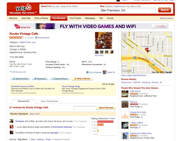 Last week a client scheduled a meeting at Kouks Vintage Coffee Shop in Chicago. Although I work very near this quaint coffee shop, I’d never been in it and I was looking forward to checking it out. The first thing I did when my client recommended we go there to meet was check Yelp to find its physical location.