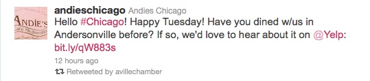 Don’t forget you can ask for reviews after your customers have left. Andies Restaurant posted a request on Twitter last week asking if you’ve dined at its restaurant and to post a review on Yelp. As someone who sometimes forgets to do things like this, it reminded me to post a review as we happened to dine there last night for a family member’s birthday party. The waiter was absolutely fabulous not only with the adults but the kids in our party and the food was fantastic. That tweet reminded me to post a review!